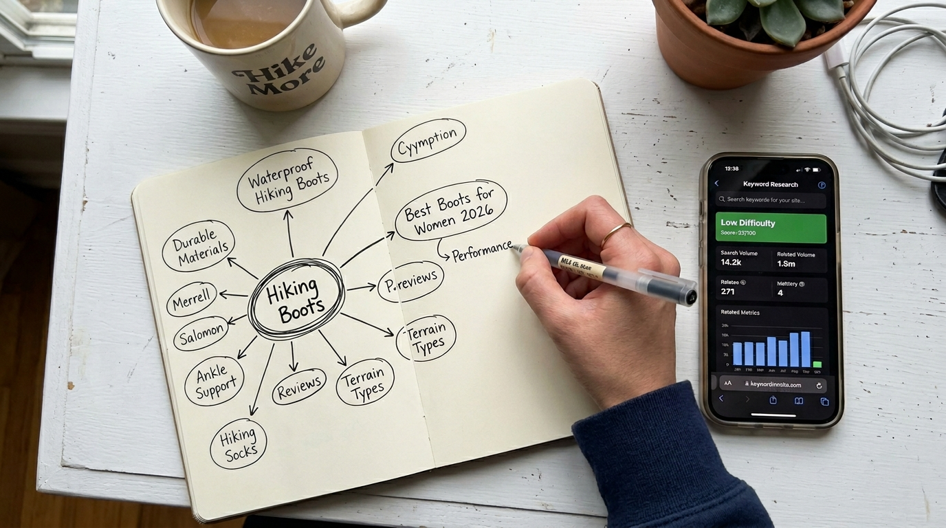 Keyword research is the process of finding the search terms your potential customers are using. Instead of guessing what people search for, you use tools to find keywords with good search volume and achievable difficulty. To organize topics, build a keyword cluster around your primary terms. Remember that half of all searches are four words or longer. These are called long tail keywords. While a term like “shoes” is too competitive, a long tail keyword like “waterproof hiking boots for women” is specific, shows clear buying intent, and is easier to rank for.
